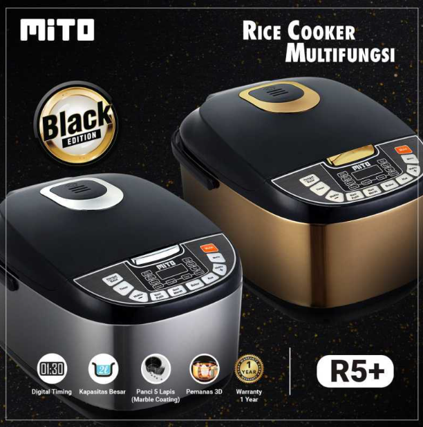 Mito Rice Cooker dengan tampilan baru dan mewah Black editon terdapat dua warna Gold Dan Silver memudahkan memasak dengan fungsi 8 in 1 memasak nasi pitih ,nasi merah , bubur , menggoreng , mengukus , membuat sop dll